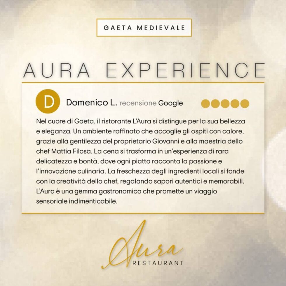 Aura Restaurant è un raffinato ristorante situato nel cuore del centro storico di Gaeta. Propone una cucina italiana e mediterranea con un’attenzione particolare alle specialità di mare, valorizzando ingredienti freschi e di alta qualità per offrire un’esperienza gastronomica unica.